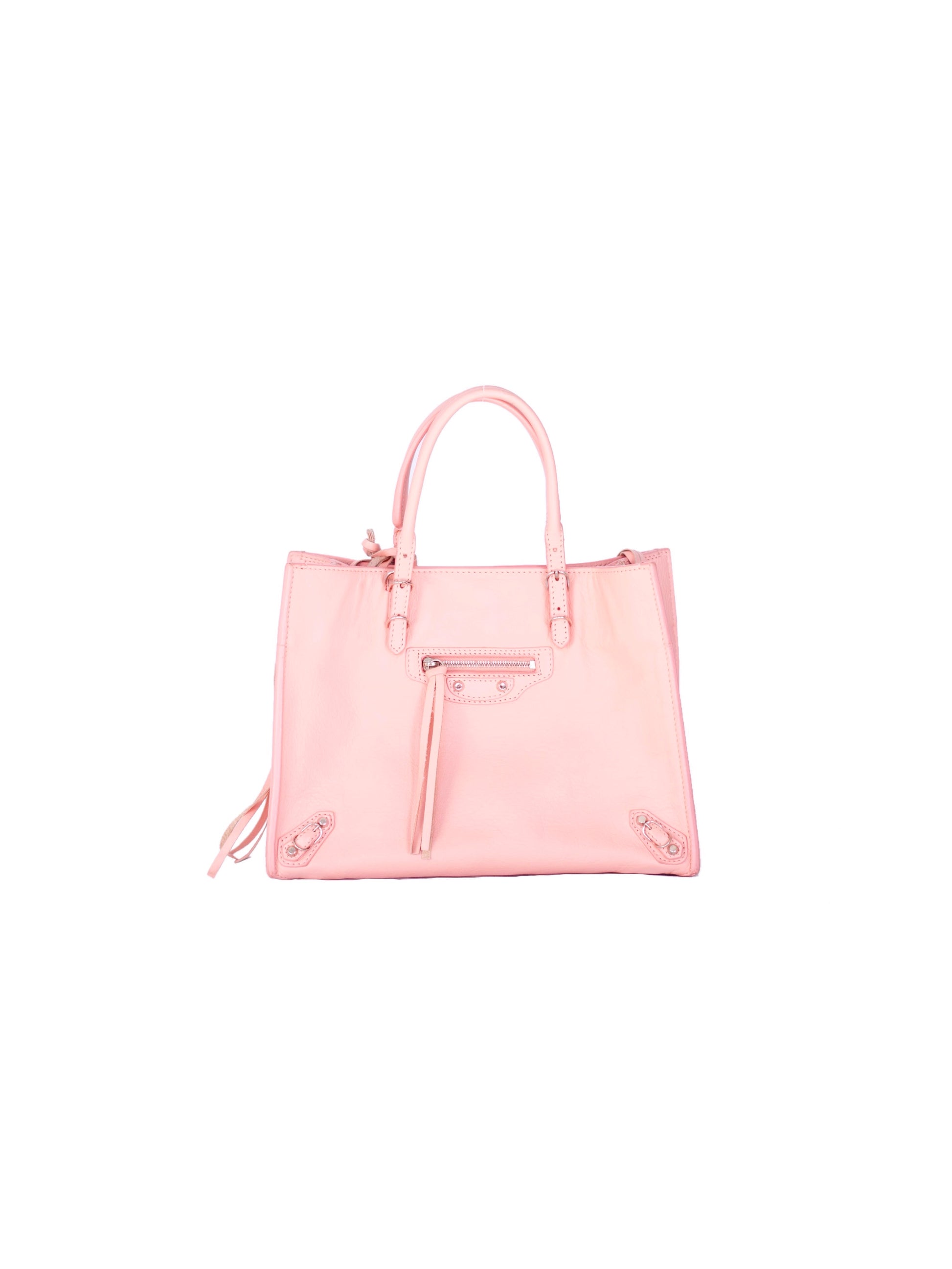 A modern icon in a playful hue. This Balenciaga Papier A6 Handbag is crafted in soft pink leather, showcasing the house’s signature structured yet effortless silhouette. Silver-tone hardware and adjustable side zips lend a touch of edge, while the open-top design keeps it sleek and functional. Perfect for everyday wear, it balances Balenciaga’s minimalist design language with a feminine twist