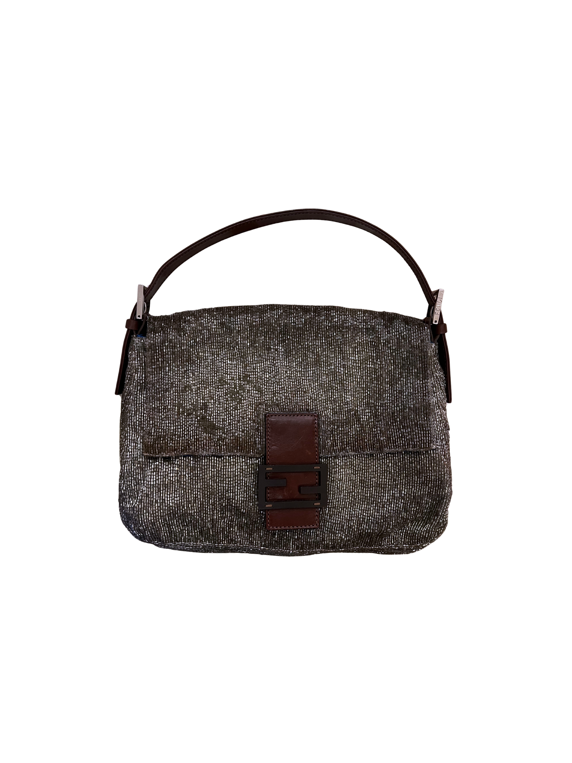 This vintage Fendi Mamma Baguette features intricate silver/pewter beading over a soft fabric body, creating subtle shimmer and texture that elevates any ensemble. The brown leather strap and matching Fendi logo add warmth and contrast, while the unexpected pop of blue lining brings a playful, contemporary edge to this iconic silhouette.
