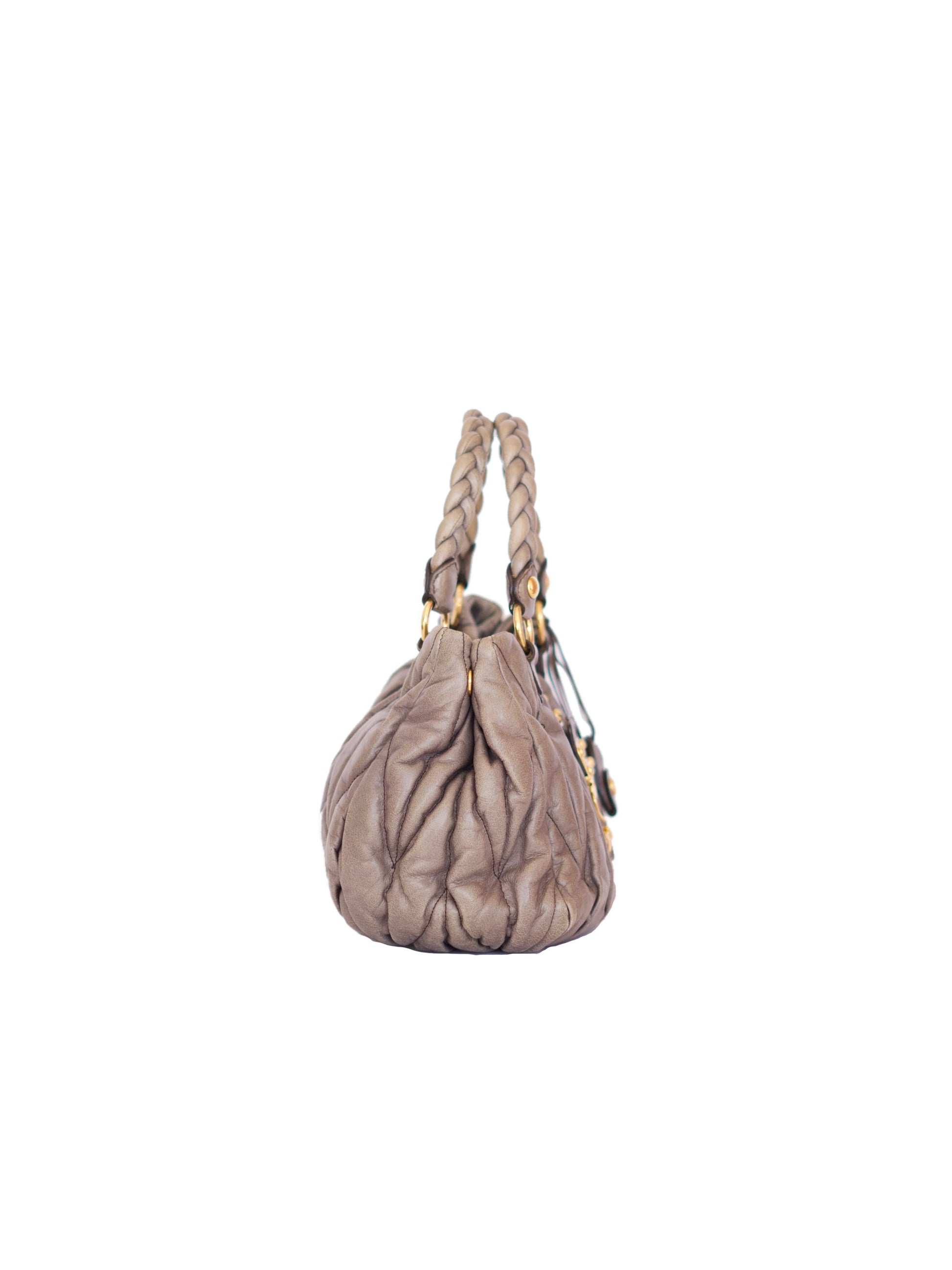 This vintage Miu Miu Handbag is crafted in dark grey matelassé leather, showcasing a quilted surface that adds depth and dimension. Gold-tone hardware accents the structured silhouette, while dual braided leather top handles offer a touch of artisanal detail and practicality for day-to-night styling. The front flap features a secure buckle closure, completing the sophisticated design.This bag comes with a removable crossbody strap.