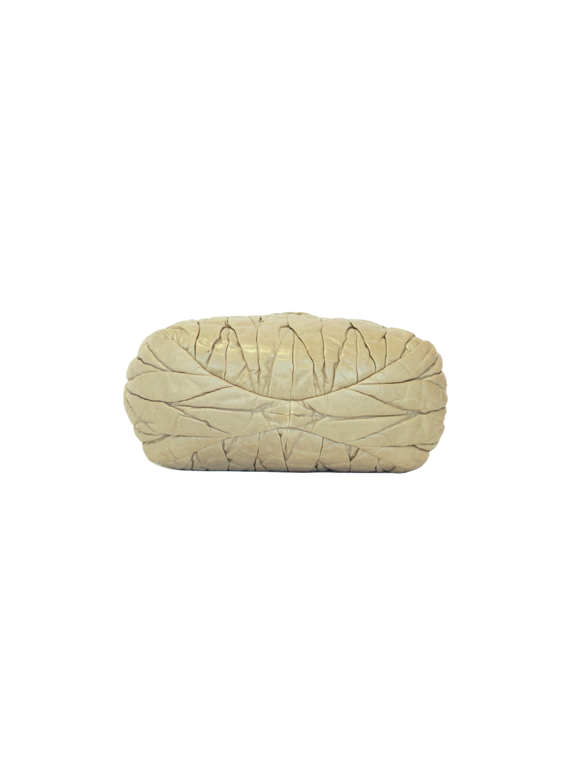 This vintage Miu Miu Handbag is crafted in light grey/green matelassé leather, offering a textured, quilted surface that catches the light beautifully. Gold-tone hardware complements the pastel hue, while dual braided leather top handles add a touch of artisanal detail. The buckle closure secures the flap with lock and key, combining functionality with style. Comes with removable shoulder strap.